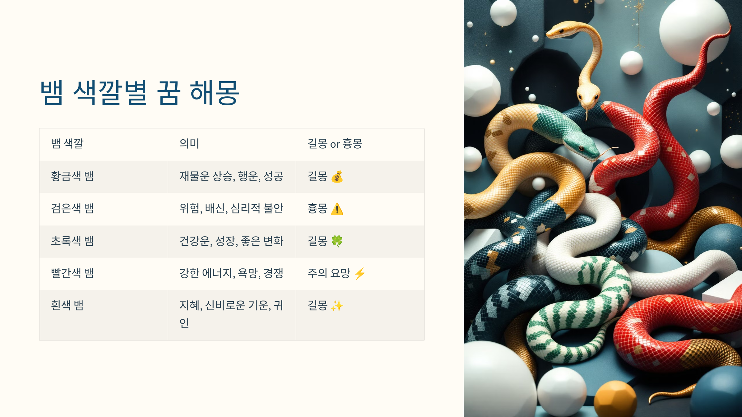 뱀의 색깔은 꿈에서 중요한 의미를 가져요. 색깔에 따라 재물운, 건강운, 경고의 메시지가 달라질 수 있답니다. 💡