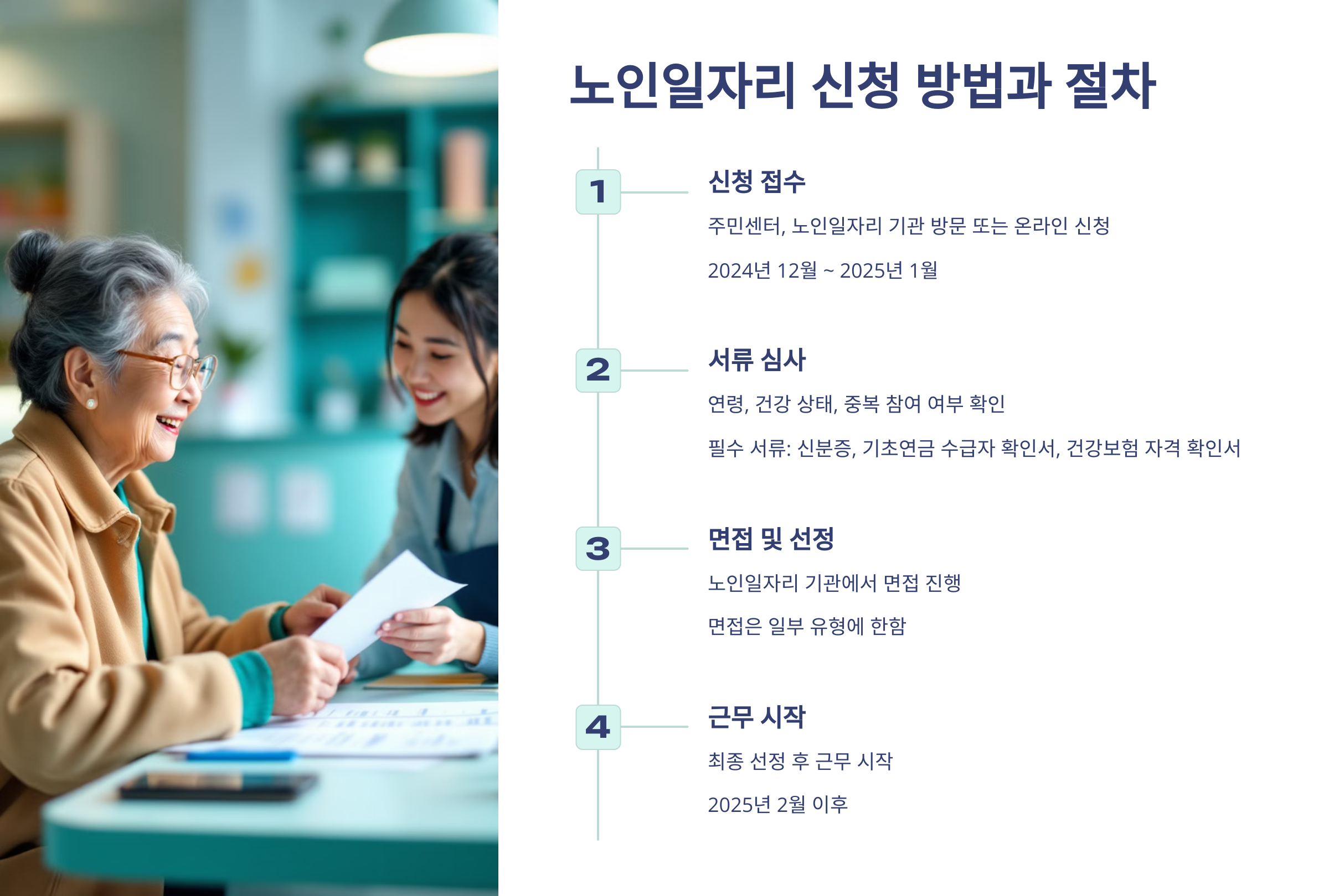 1. 신청 접수 주민센터, 노인일자리 기관 방문 또는 온라인 신청 2024년 12월 ~ 2025년 1월