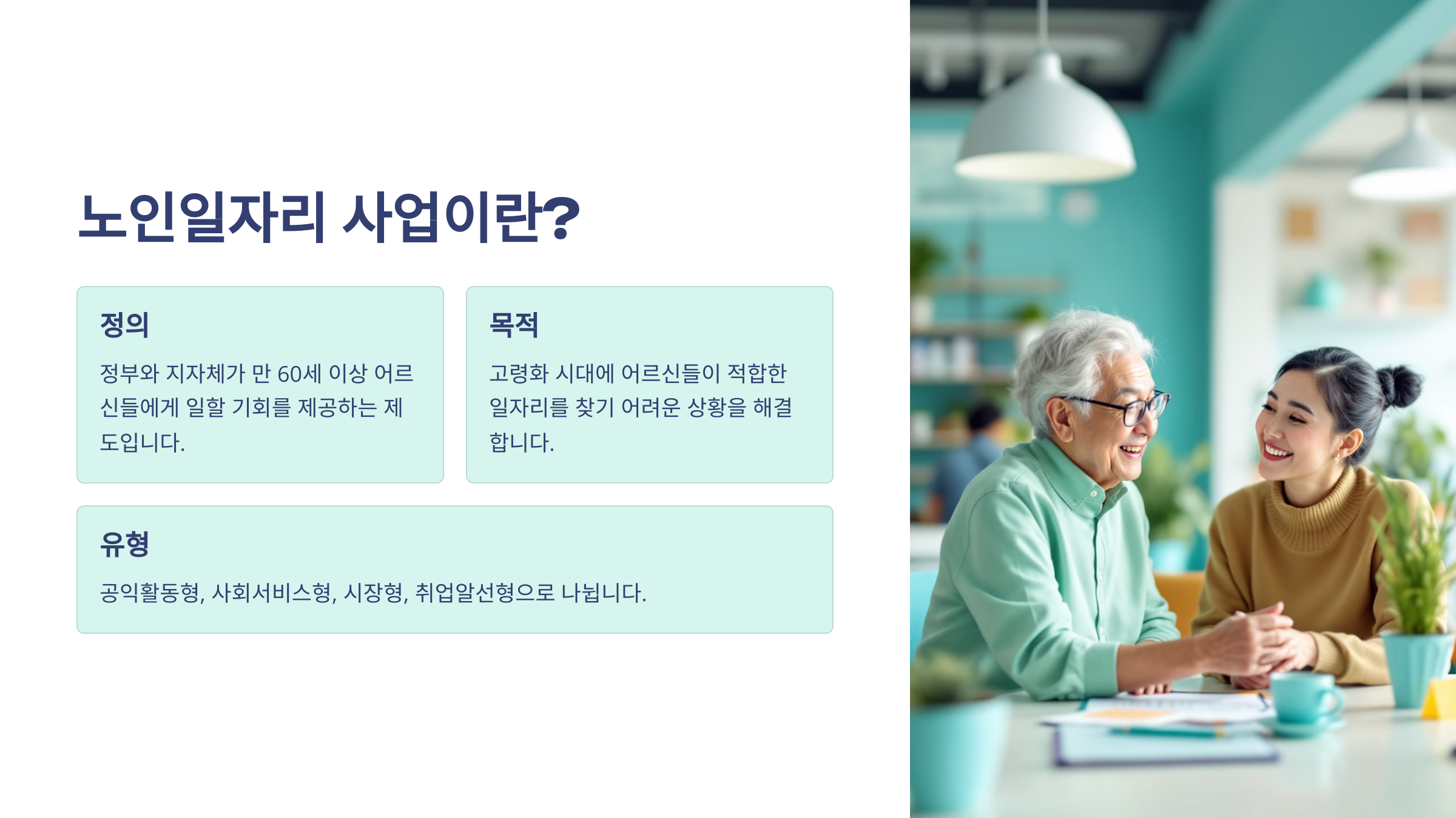 고령화가 심화되면서 많은 어르신들이 경제 활동을 원하지만, 적합한 일자리를 찾기 어려운 경우가 많아요. 이를 돕기 위해 노인들에게 적합한 맞춤형 일자리를 제공하는 것이 바로 "노인일자리 사업"이에요! 🏡
