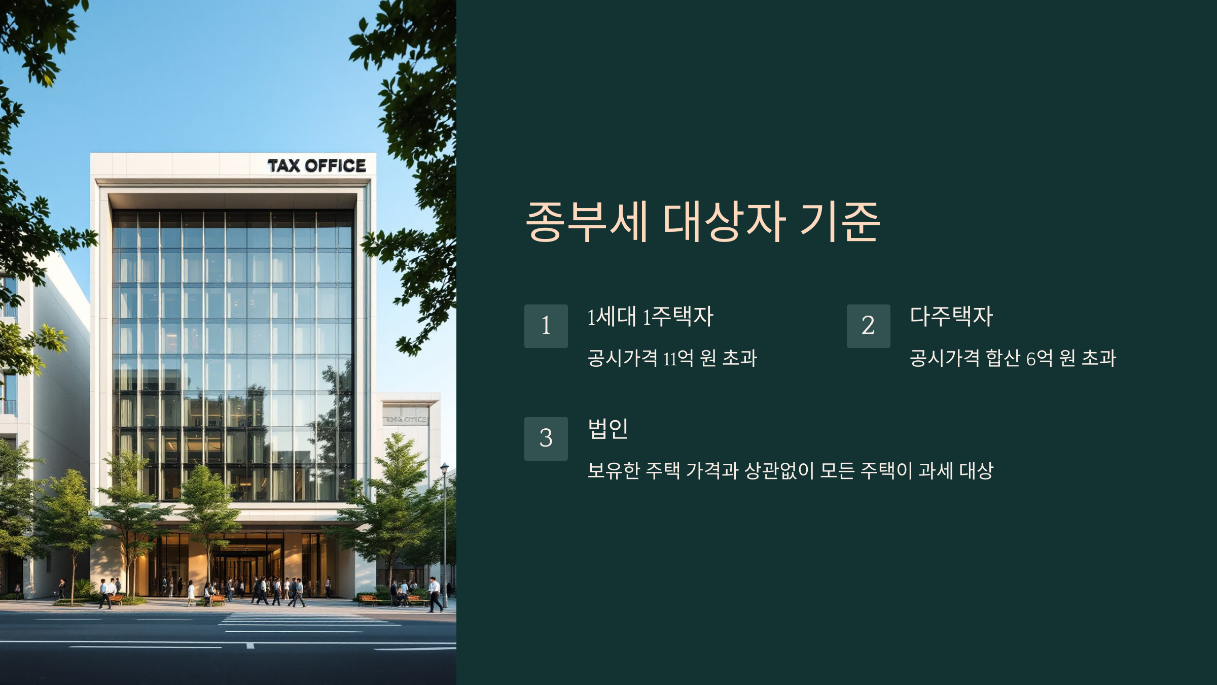📌 **기본 종부세 부과 기준** ✅ 1세대 1주택자: 공시가격 **11억 원 초과** ✅ 다주택자: 공시가격 합산 **6억 원 초과** ✅ 법인: 보유한 주택 가격과 상관없이 **모든 주택이 과세 대상**