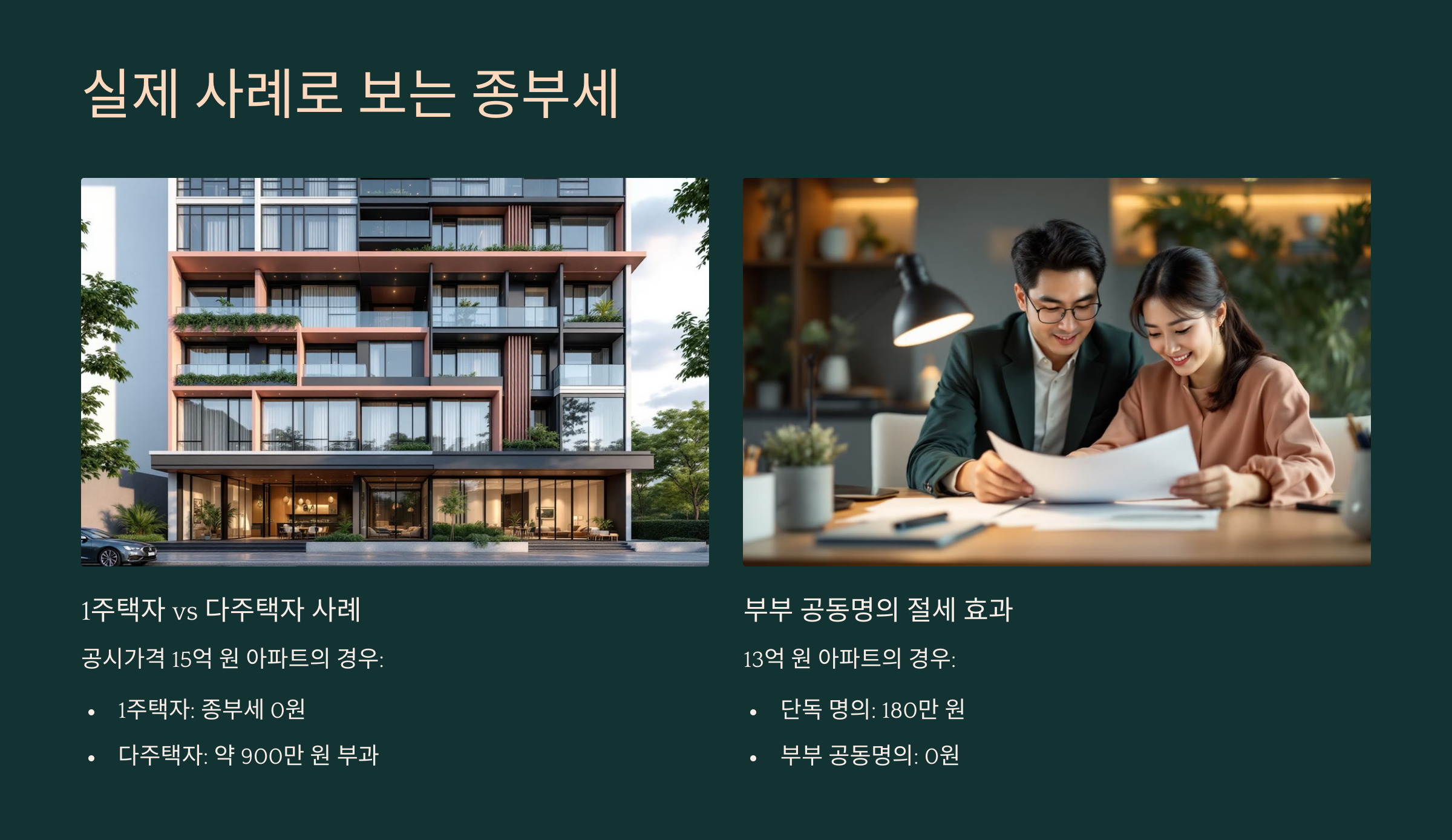 실제 사례를 보면 종부세가 어떻게 적용되는지 쉽게 이해할 수 있어요. 주택 수와 공시가격에 따라 세 부담이 얼마나 달라지는지 살펴볼까요? 👀