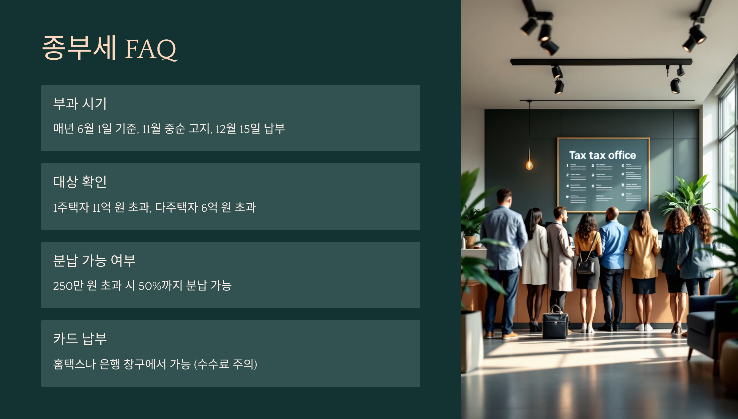 💡 **종부세 분납 가능할까?** 세액이 **250만 원 이상이면 50%까지 분납**이 가능해요. 첫 번째 분납 기한은 12월 15일, 나머지 금액은 다음 해 6월까지 납부하면 됩니다.