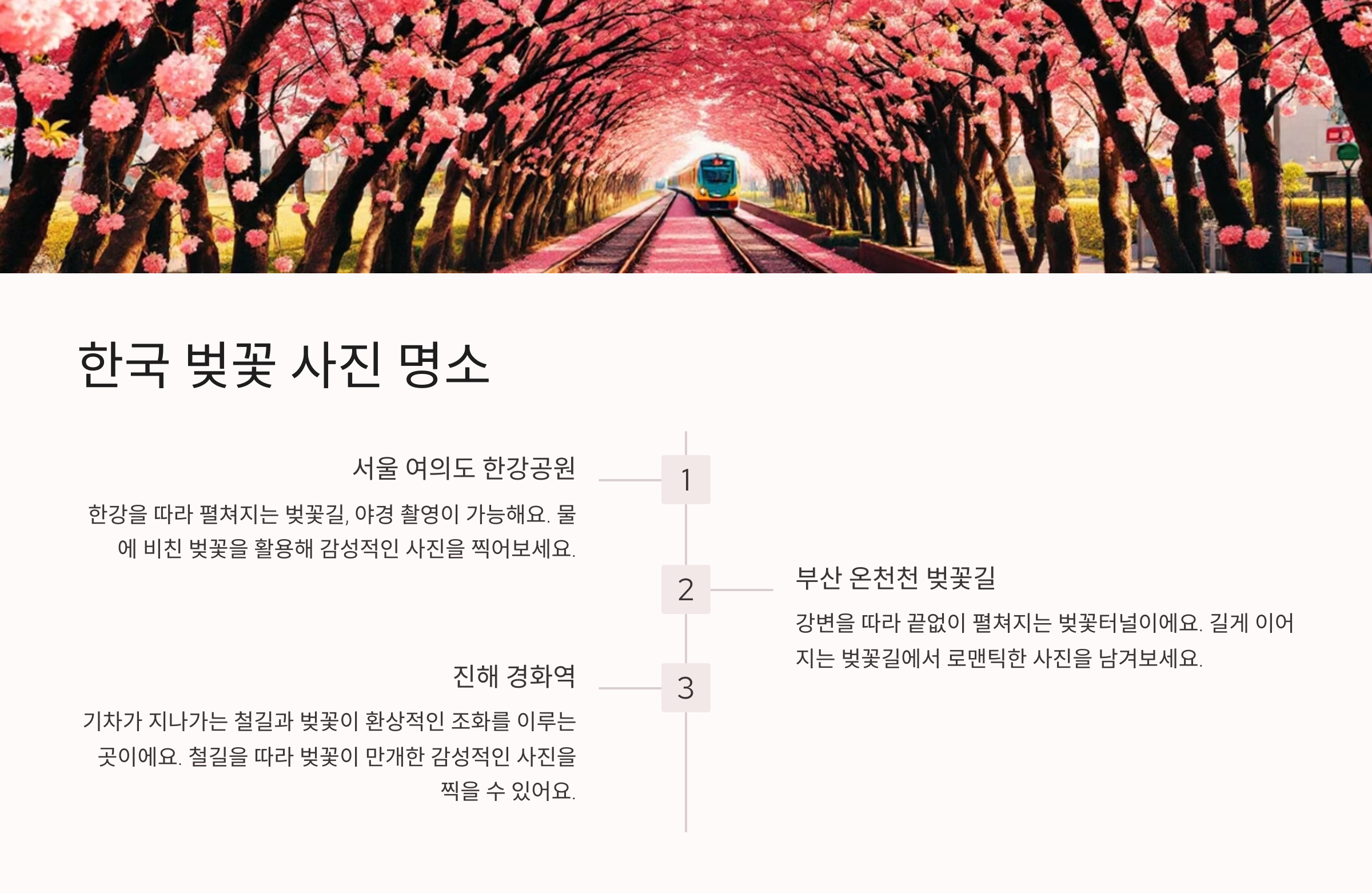 한국에도 벚꽃을 배경으로 멋진 사진을 찍을 수 있는 곳이 많아요! 서울, 부산, 경주 등 전국의 대표적인 벚꽃 명소를 소개할게요. 🌸📷