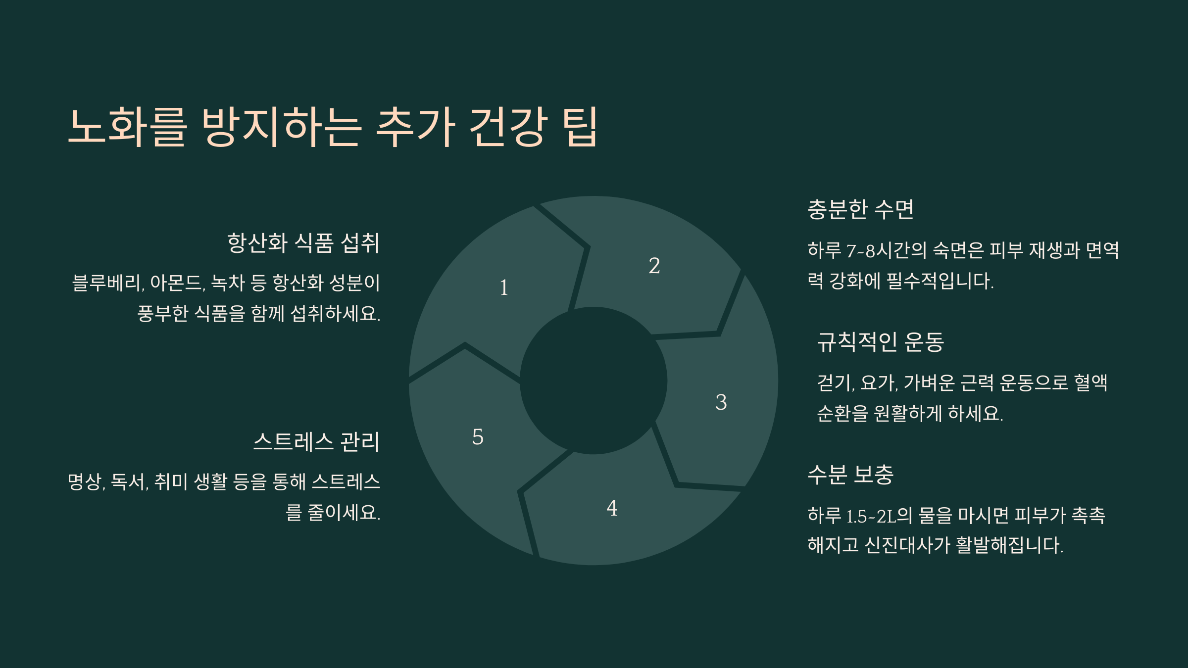 👉 블루베리, 아몬드, 녹차처럼 항산화 성분이 풍부한 식품을 함께 섭취하면 노화 방지 효과가 더욱 높아져요.