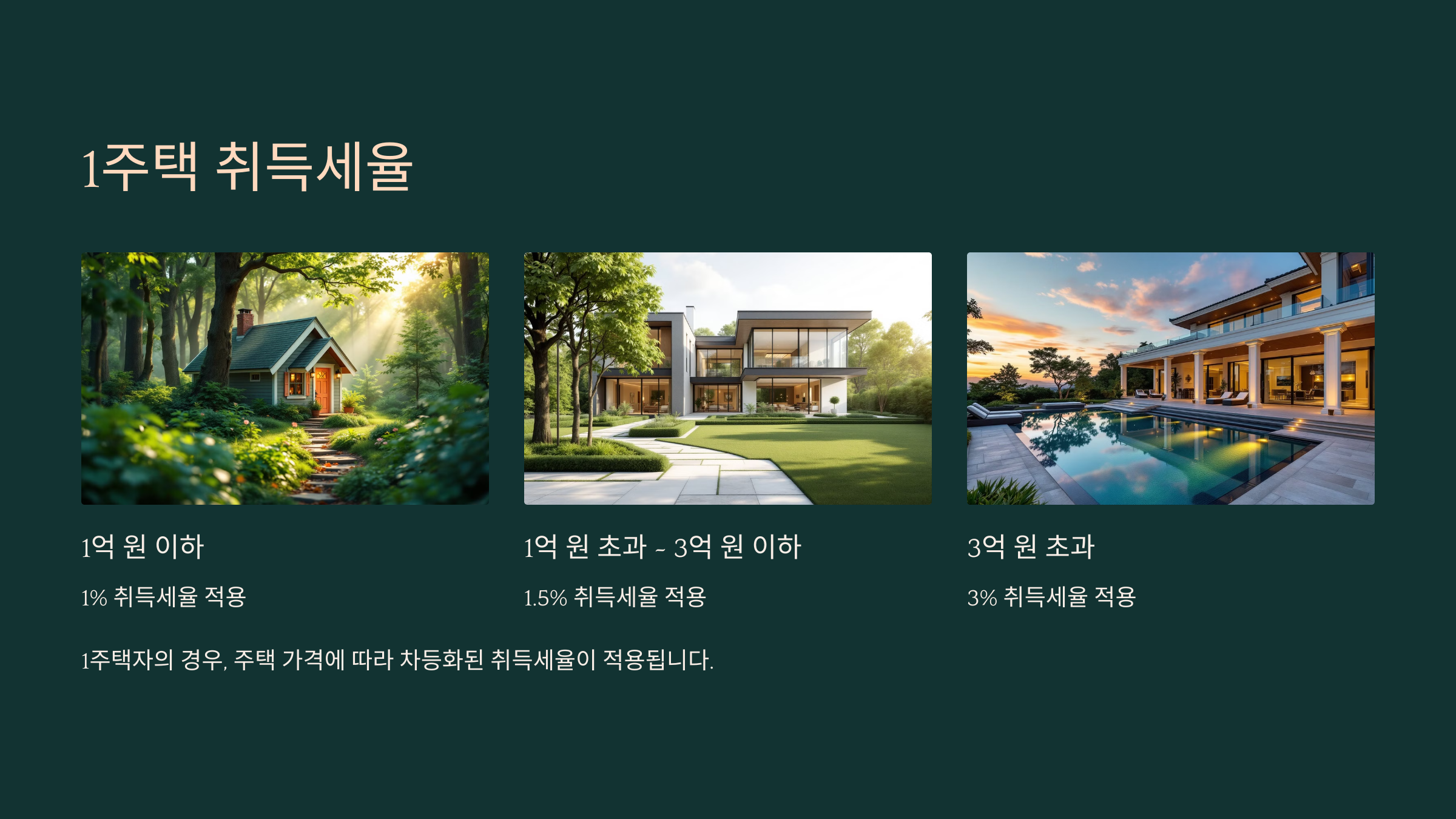 1주택을 보유한 사람이 추가로 주택을 매입하지 않는다면, 비교적 낮은 취득세율이 적용돼요. 기본적으로 주택 가격에 따라 1~3%의 세율이 부과되죠. 세율 구조는 다음과 같아요.