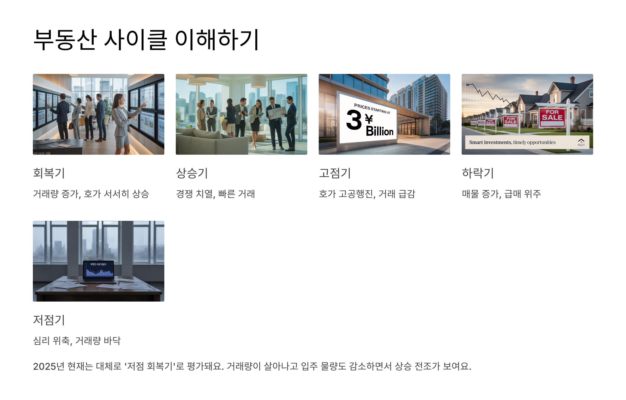 사이클의 각 국면마다 특징이 있어요. 회복기에는 거래량이 증가하고 호가가 서서히 오르기 시작해요. 상승기에는 경쟁이 붙고 입찰이 심화되죠. 고점기엔 호가가 급등하지만 거래량은 줄고, 하락기에는 심리 위축과 급매물이 많아져요. 저점기는 반등 준비 국면이에요.