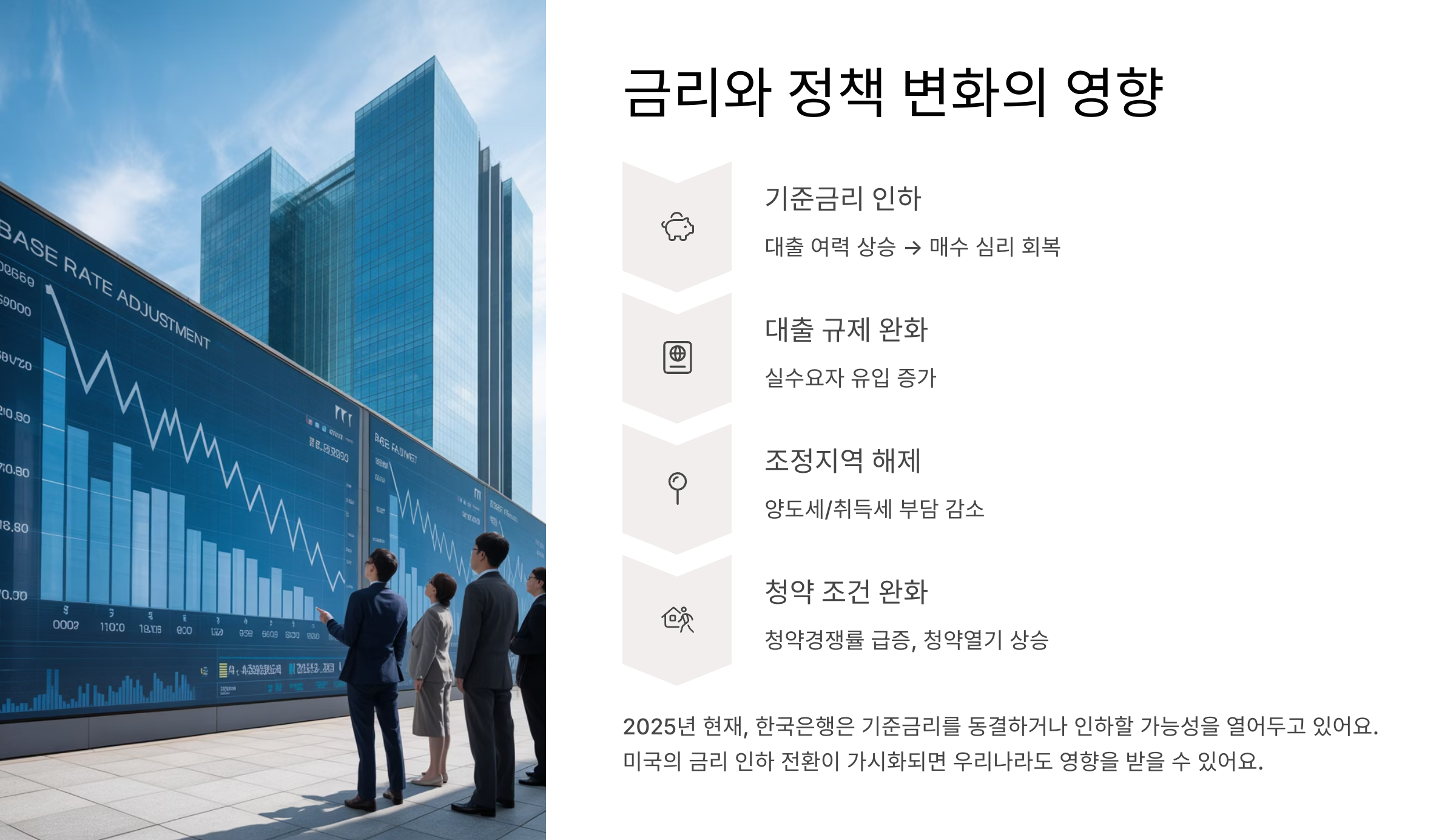 2025년 현재, 한국은행은 기준금리를 동결하거나 인하할 가능성을 열어두고 있어요. 미국의 금리 인하 전환이 가시화되면 우리나라 역시 이에 영향을 받을 수 있어요. 금리가 떨어지면 대출 부담이 줄고, 매수자들이 다시 움직이기 시작하죠.