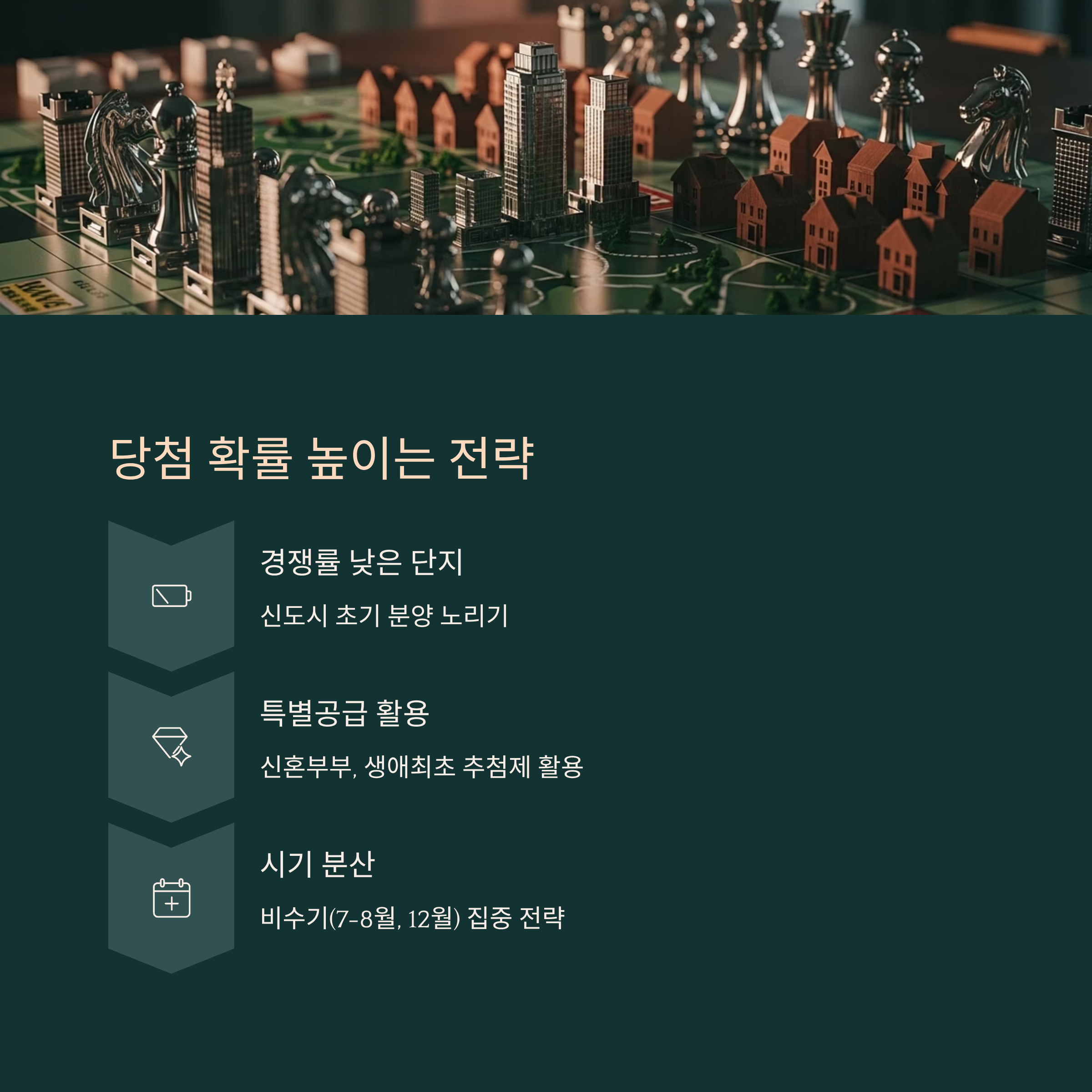 그렇다면 점수가 낮은 사람은 희망이 없을까요? 아니에요! 가점제 외에도 추첨제를 활용한 전략이 있어요. 특히 생애최초 특별공급, 신혼부부 특별공급 등은 추첨이 병행되기 때문에 다양한 전략을 함께 활용하면 당첨 가능성을 높일 수 있어요! 🧩