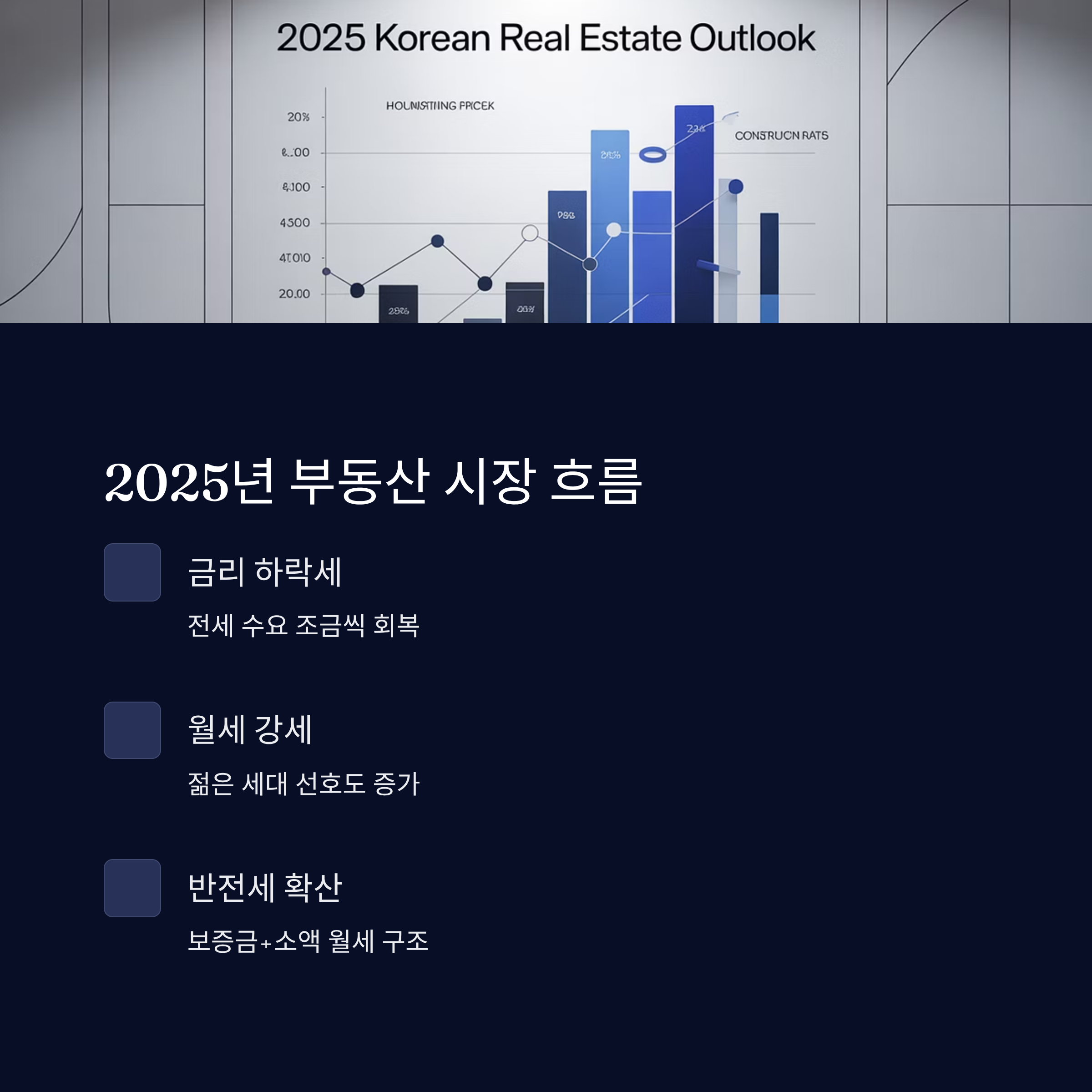 2025년 현재, 부동산 시장은 금리, 공급, 정부 정책 변화에 따라 크게 흔들리고 있어요. 2024년에 이어 금리가 완만하게 하락세를 보이면서 전세 수요가 조금씩 회복되고 있지만, 월세 수요도 여전히 강세를 보이고 있는 상황이에요. 특히 수도권 외곽이나 지방 중소도시에서는 여전히 월세가 우세한 추세예요.