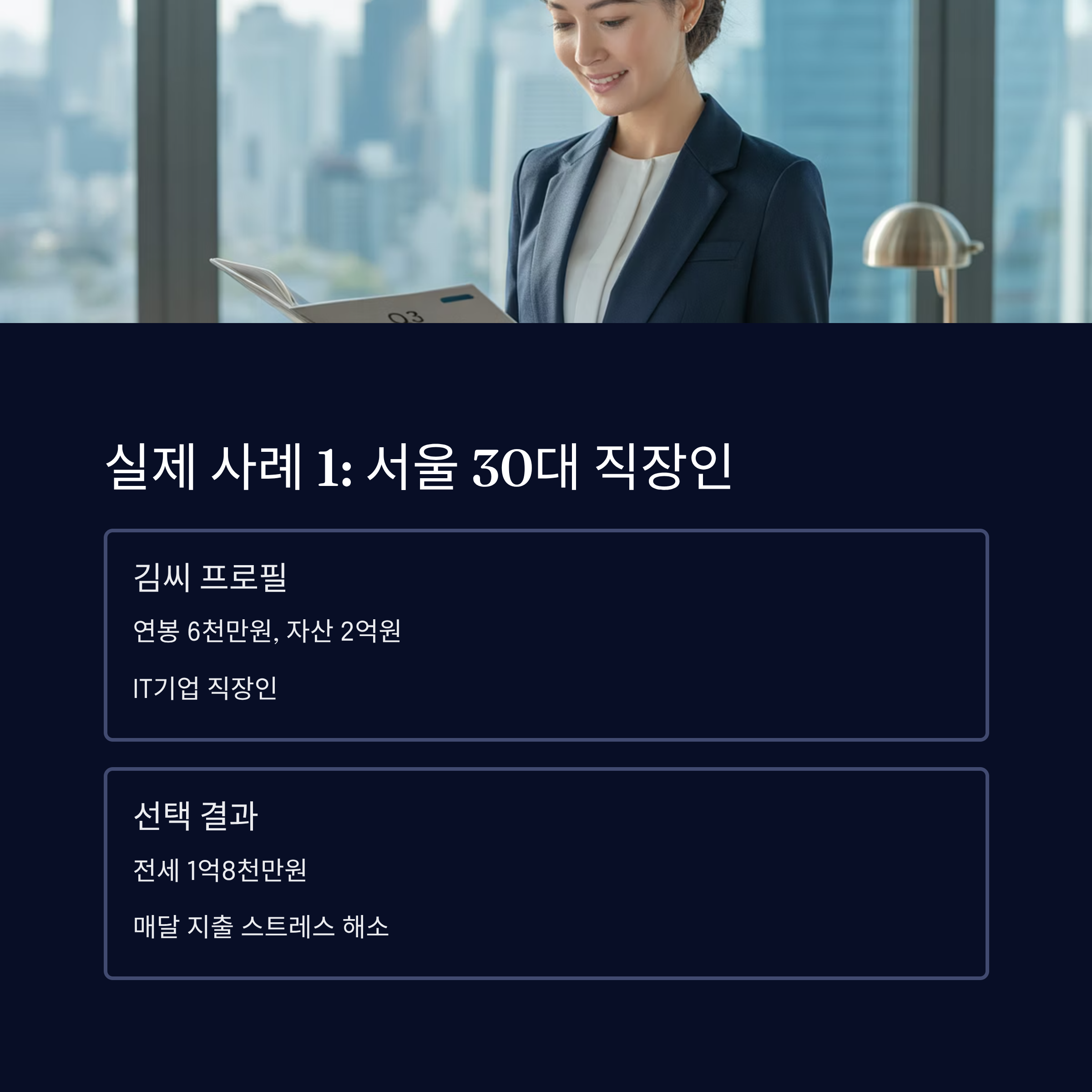 첫 번째 사례는 서울에 거주하는 30대 중반 직장인 김모 씨의 이야기예요. 김 씨는 IT기업에 다니며 연봉은 약 6000만 원 수준이고, 2억 원의 자산을 갖고 있어요. 결혼 계획은 아직 없고, 직장 근처에서 출퇴근이 편한 원룸이나 오피스텔을 원했어요. 김 씨는 처음에 월세를 알아봤지만, 자산이 묶이지 않는 대신 매달 지출이 너무 크다고 느꼈어요.