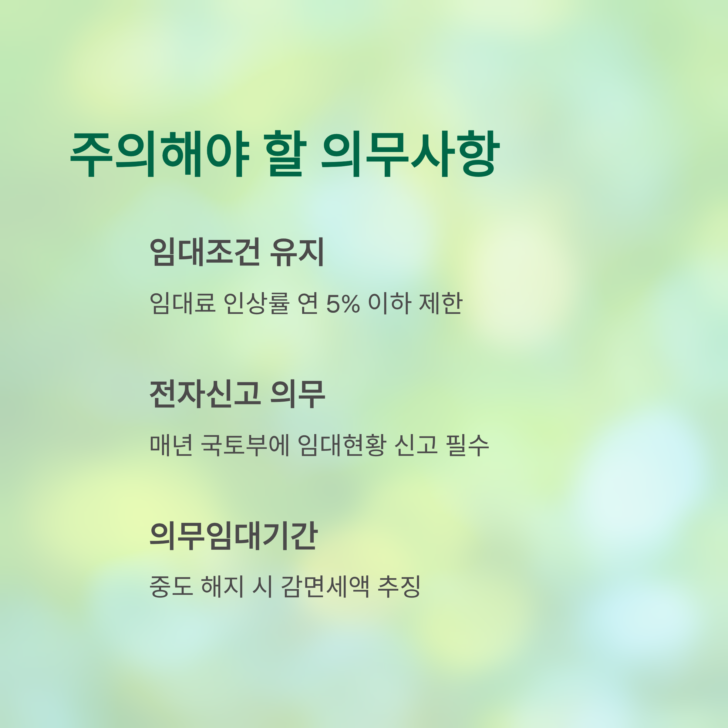 단, 등록 후 중도 해지하거나 의무를 위반하면 감면받은 세금을 다시 추징당할 수 있기 때문에 주의가 필요해요. 그래서 등록은 신중하게 접근해야 하고, 중장기 계획을 세우는 게 좋아요.