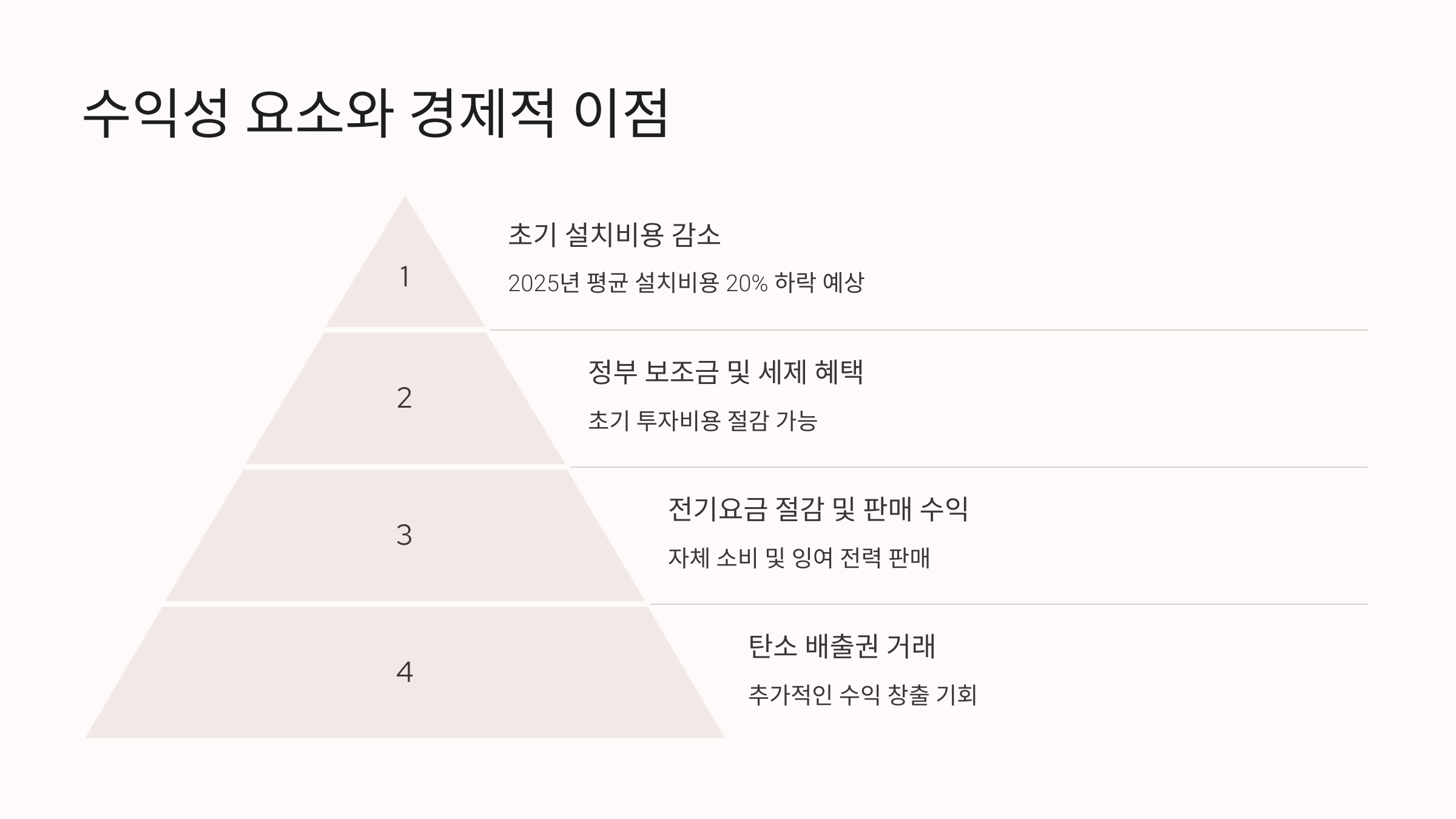 태양광 사업의 수익성을 판단하기 위해 가장 중요한 요소는 초기 설치비용과 운영비용, 그리고 전력 판매 수익이에요. 다행히 기술 발전과 규모의 경제 덕분에 태양광 패널의 단가가 꾸준히 하락하고 있어요. 2025년에는 평균 설치비용이 현재보다 약 20% 더 낮아질 것으로 예상된답니다.