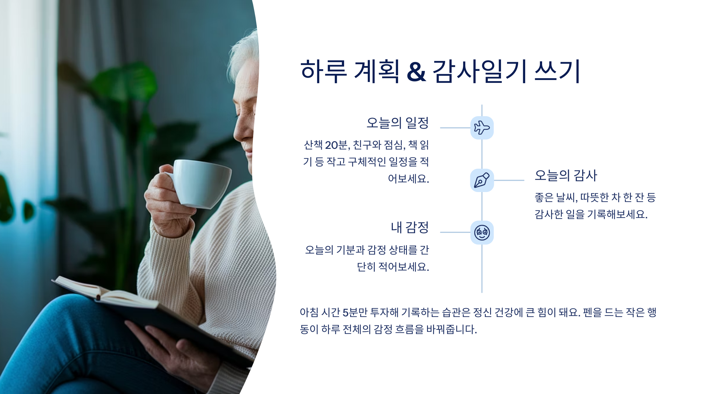 아침 시간 5분만 투자해 ‘오늘 하루 무엇을 할지’, ‘무엇에 감사하는지’를 기록하는 습관은 정신 건강에 정말 큰 힘이 돼요. 특히 60대 이후엔 작은 목표와 긍정적인 시선이 일상의 활력을 키우는 열쇠가 되죠.