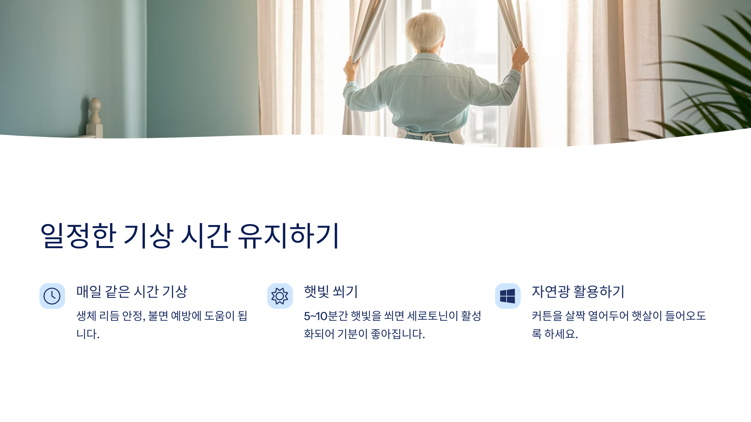 60대 이후의 건강한 하루는 '같은 시간에 일어나는 것'에서 시작해요. 불규칙한 기상은 몸과 마음의 피로를 더 누적시키니까요.